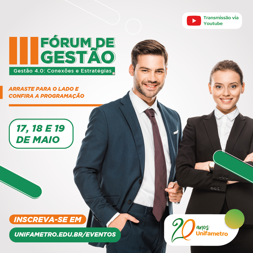 O Centro Universitário Fametro (Unifametro) promove, entre os dias 17 e 19 de maio, o III Fórum de Gestão, a partir das 19h, com o tema “Gestão 4.0: Conexões e Estratégias”. O evento reúne gestores de grandes empresas, como San Paolo Gelato, Leroy Merlin e M. Dias Branco, em palestras e rodas de conversas virtuais no canal do YouTube da instituição.