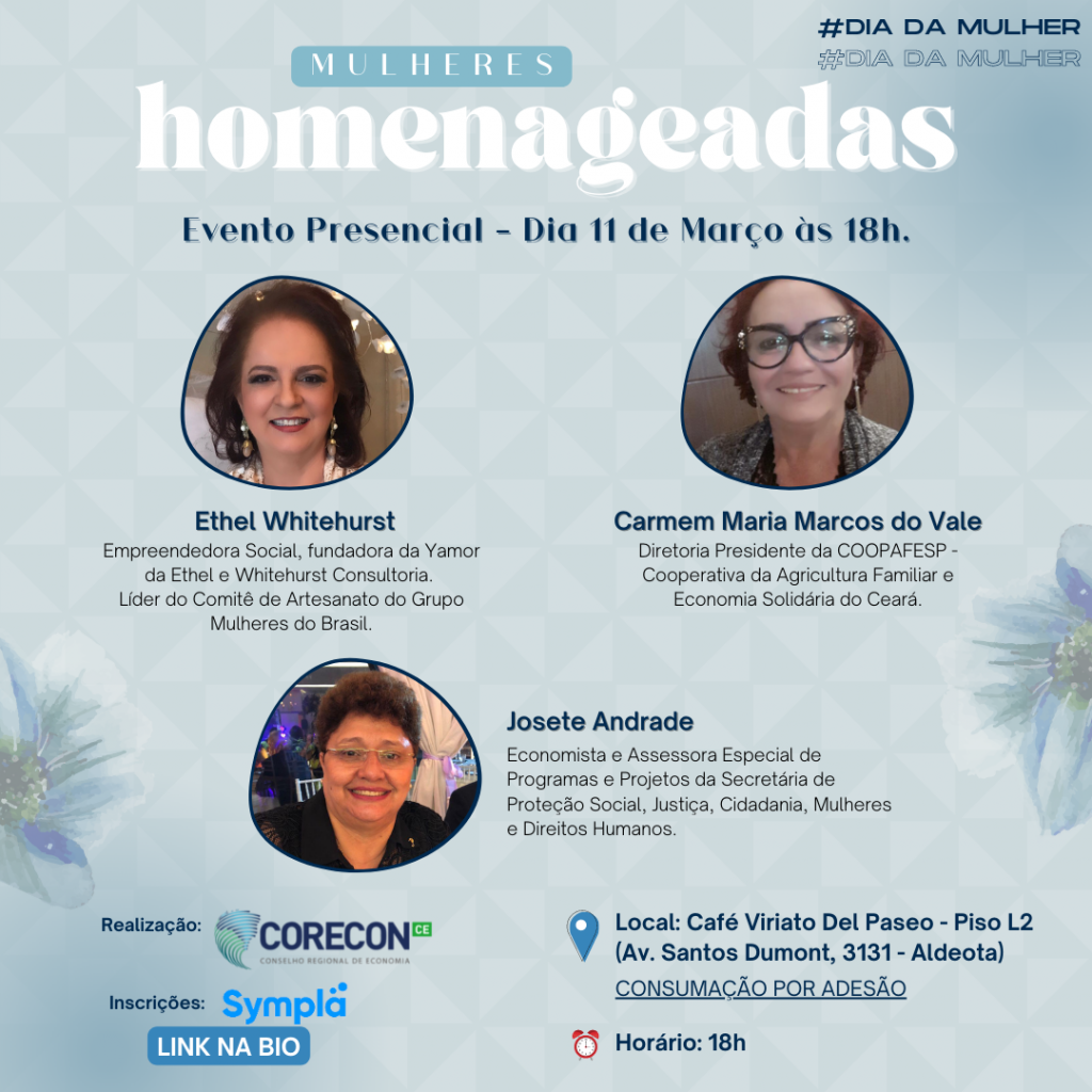 Homenagem O Conselho Regional de Economia do Ceará (Corecon-CE) realiza, nesta sexta (11/03), o evento em comemoração ao dia da mulher. Economistas e empreendedoras de destaque serão homenageadas no evento a ser realizado no Café Viriato Del Paseo, a partir das 18h, com capacidade reduzida em cumprimento às normas sanitárias.