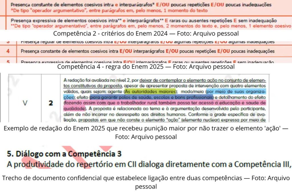 Os documentos também indicam que o repertório sociocultural passou a ter peso maior do que o previsto inicialmente. Embora o Manual do Candidato já alertasse para o combate aos chamados “repertórios de bolso”, um documento adicional enviado após os treinamentos determinou que referências consideradas inadequadas passassem a impactar simultaneamente as competências 2 e 3.