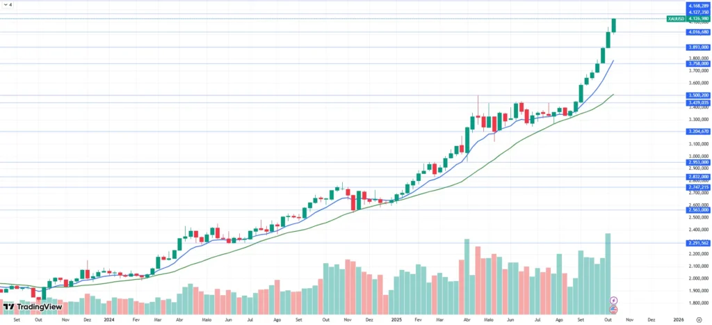Do ponto de vista técnico, o ouro acumula alta superior a 55% em 2025 e segue renovando topos — no gráfico semanal o ativo chegou a US$ 4.132. Médias móveis inclinadas para cima e o posicionamento dos compradores acima das médias de 9 e 21 períodos confirmam a força do movimento. Apesar disso, existe margem para correções técnicas saudáveis antes de novas escaladas.