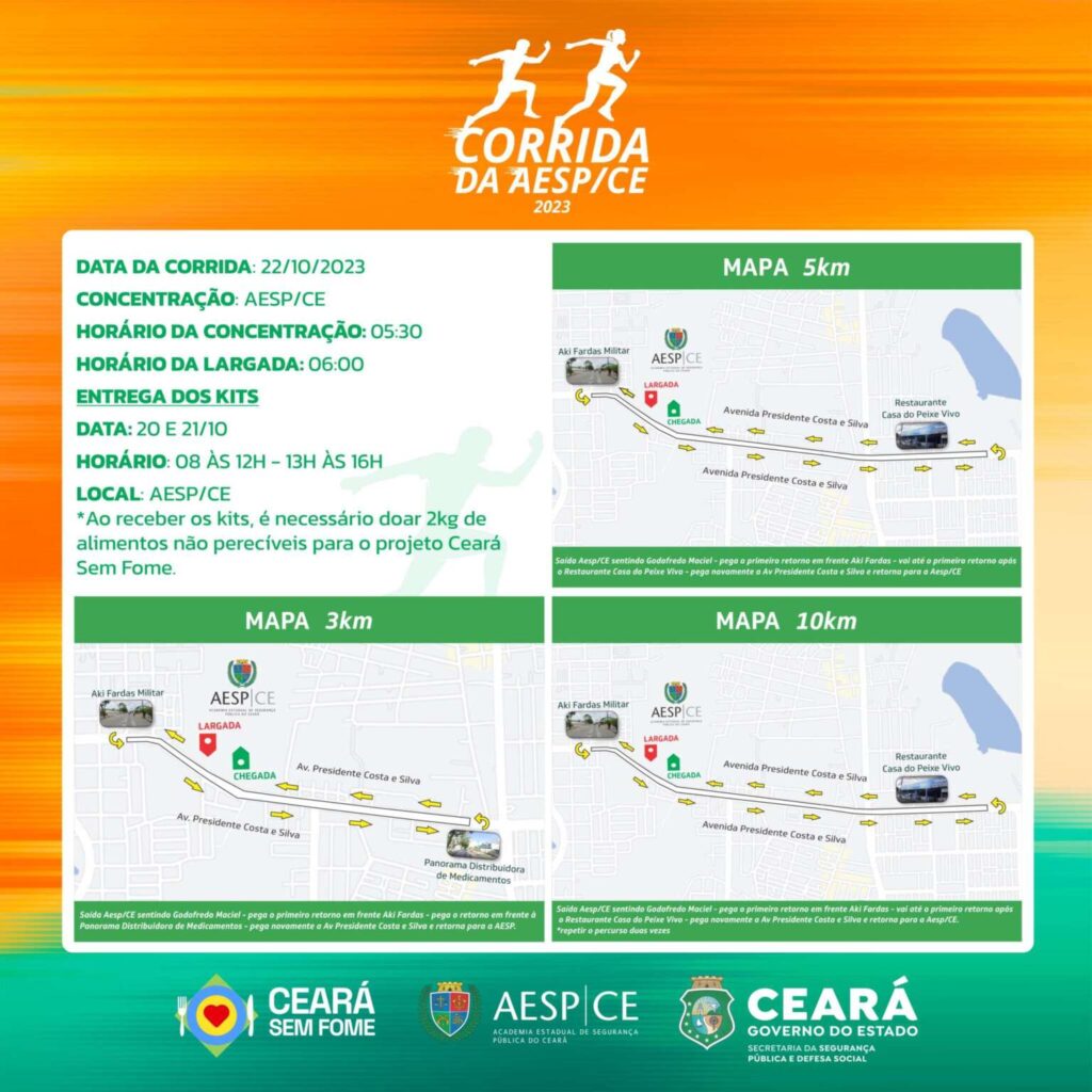 Está confirmada para o domingo (22), a partir das 6 horas, a largada da Corrida da Academia Estadual de Segurança Pública (Aesp/CE). A prova tem percursos de 3, 5 e 10 quilômetros, com premiações individuais, além de medalhas para todos os participantes que completarem os respectivos percursos.
