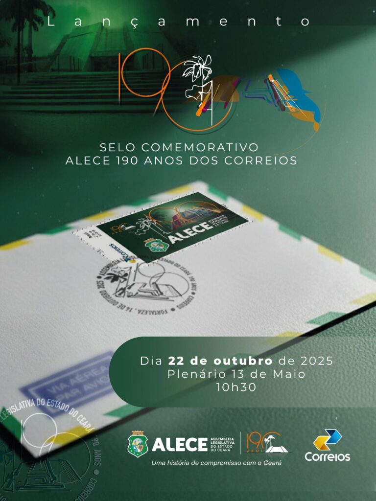 21 de outubro de 2025 – Como parte das comemorações pelos 190 anos da Assembleia Legislativa do Estado do Ceará (Alece), os Correios lançam, nesta quarta-feira (22/10), um selo e um carimbo comemorativos em homenagem à trajetória da instituição. A cerimônia acontece durante a sessão ordinária, a partir das 9h30, no Plenário 13 de Maio, e encerra as homenagens oficiais alusivas ao aniversário da Casa do Povo.