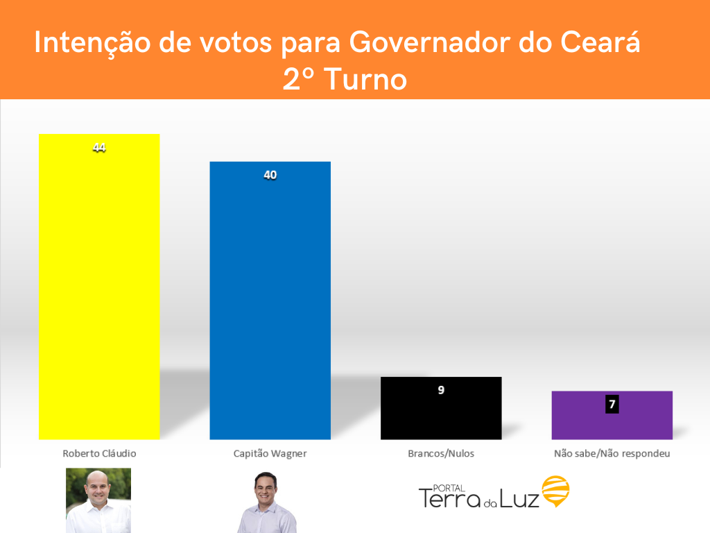 Confira os números do primeiro cenário. Roberto Cláudio teria 44% dos votos. Capitão Wagner, surge com 40%. Brancos e nulos somariam 9% e não sabem/não responderam, 7%.