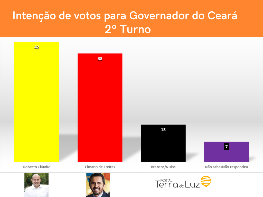 No segundo cenário, Roberto Cláudio também venceria se o opositor no segundo turno fosse Elmano de Freitas. Roberto Claudio teria 42% dos votos e Elmano de Freitas, teria 38% dos votos. Brancos e nulos, somariam 13% e não sabem/não responderam, 7%.