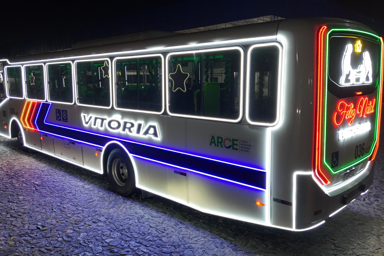 Há dez anos que a Vitória registra momentos com as pessoas maravilhadas com Papai Noel na direção, espalhando alegria por onde passa. São 300 metros de fita de led neon que envolvem o veículo. As viagens acontecem de segunda a sábado, com roteiro previamente estabelecido.